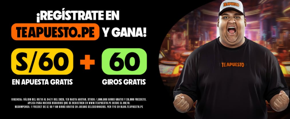 La empresa internacional señala que, al registrarse en Te Apuesto Perú, los usuarios reciben S/60 en apuesta gratis, además de 60 giros gratis. Cada giro tiene un valor de S/0,20 y puede utilizarse únicamente en determinados juegos del proveedor Pragmatic Play.
