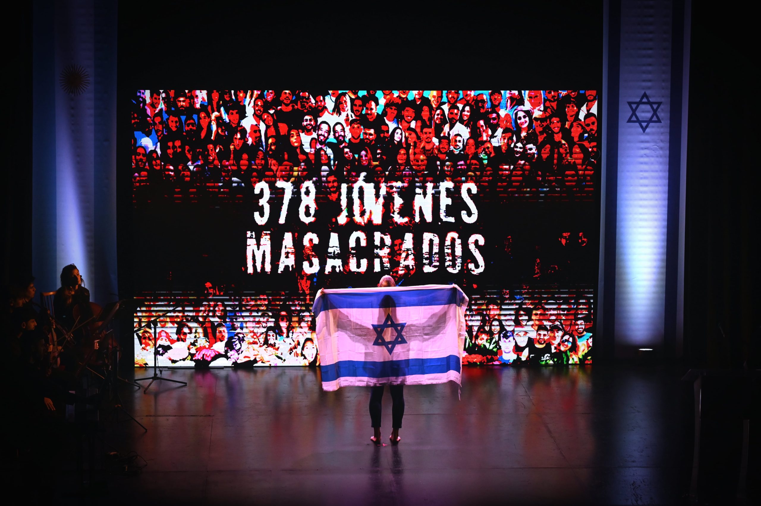 Tras la conferencia, se realizó un acto en el teatro de la Sociedad Hebraica conducido por la periodista de Infobae Tatiana Schapiro. La conmemoración empezó con sonidos e imágenes del 7 de octubre. Se escucha a una chica que pide auxilio a su papá o un nene que cuenta que a su papá acaban de matarlo en la puerta de su casa. En las imágenes, se ve la irrupción de los terroristas en el sur de Israel y cómo saquearon y quemaron las casas de los kibutz. “Deja el teléfono, haz silencio y hacete la muerta”, le dice un padre desesperado que intenta ayudar a su hija adolescente.
