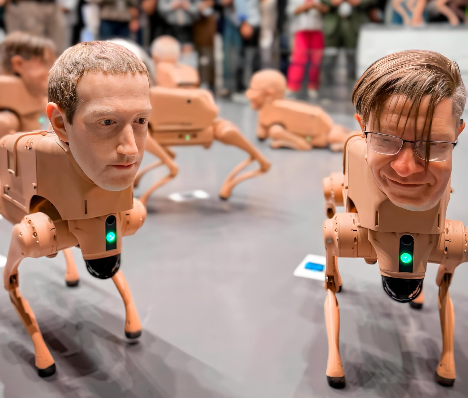 Dentro de cada uno de estos robots se encuentra una pequeña cámara que toma imágenes de los alrededores. Las mismas son luego procesadas por inteligencia artificial que las reinterpreta acorde el estilo de cada personaje, para instantáneamente pasar a ser expulsadas en forma de fotografías por los traseros robóticos de las criaturas quienes imitan la posición de un perro al defecar. Todo esto sucede al mismo tiempo que decenas de personas se amontonan entusiasmadas teléfono en mano preparadas para registrarlo todo. La obra entretiene, al mismo tiempo que logra plantear una analogía entre estas máquinas ávidas de capturar y elaborar la realidad a través de una inteligencia exógena y el mismo público que las replica cámara en mano. Pero el circo de lo real es divertido hasta que deja de serlo.
