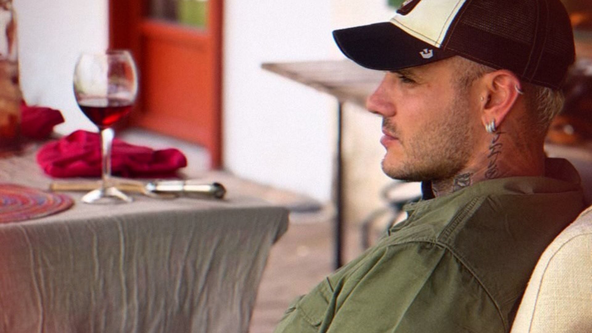 Icardi fue retratado sentado relajado en un sillón de tapizado claro, vistiendo una camisa verde oliva, bermudas claras y una gorra con un bordado de león y la palabra “King”. Mostró tatuajes en cuello y brazos, y completó el look con pulseras doradas. La mesa frente a él exhibía copas de vino tinto, platos, servilletas y manteles coloridos, reflejando un clima distendido de sobremesa y disfrute.