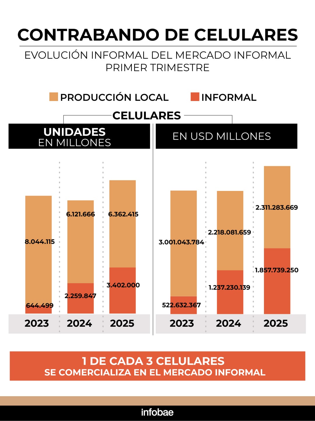 La medición en dólares también refleja la magnitud del fenómeno. De acuerdo con los datos de 2025, el mercado de contrabando generó ingresos por USD 1.858 millones, mientras que las ventas de celulares de producción nacional alcanzaron los USD 2.311 millones. De esta manera, el segmento ilegal representó cerca del 45% del mercado medido en dólares, lo que evidencia su peso dentro de la estructura general del sector.
