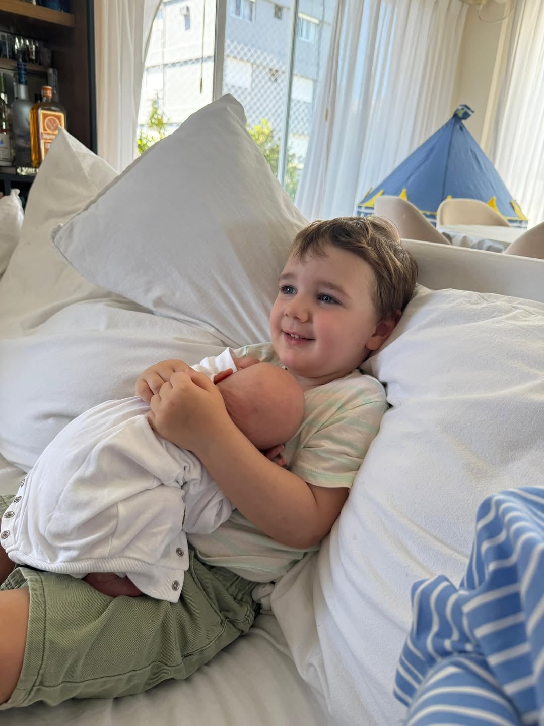 Rufino es el hijo de Mariana, quien ya es mamá de Fermín, el primer nieto del diseñador. En las imágenes que acompañaron el anuncio, puede verse a Fermín sosteniendo al recién nacido con una mezcla de curiosidad y ternura. El mayor de los hermanos sonríe mientras abraza a Rufino, en una postal que refleja el clima de alegría y unión familiar. En otra de las fotos, ambos comparten una siesta en el sofá, con Fermín atento a los movimientos del bebé y Rufino acurrucado en los brazos de su hermano.