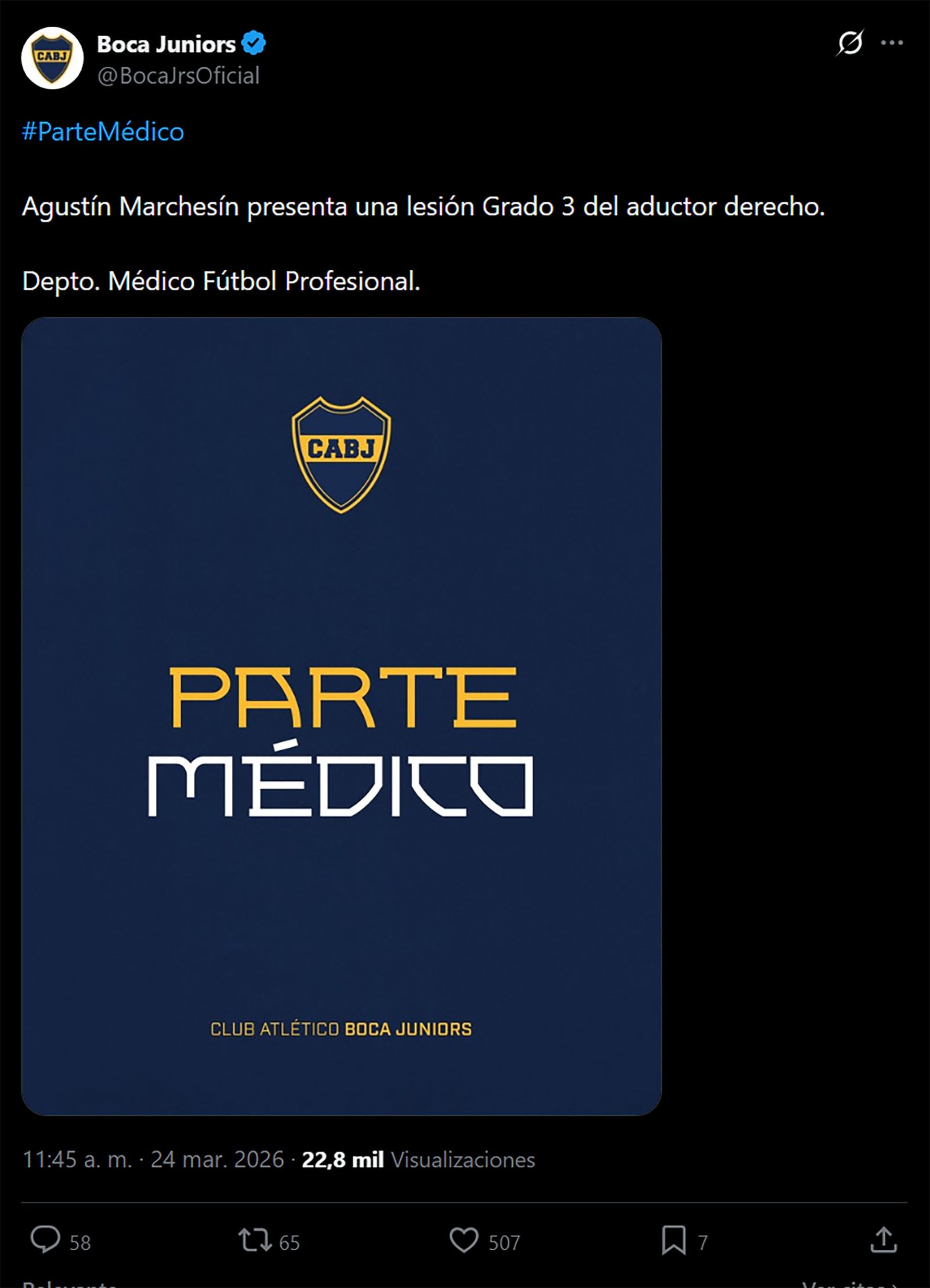Un tuit oficial de Boca Juniors detalla que el jugador Agustín Marchesín sufre una lesión Grado 3 en el aductor derecho, presentando el parte médico del club.