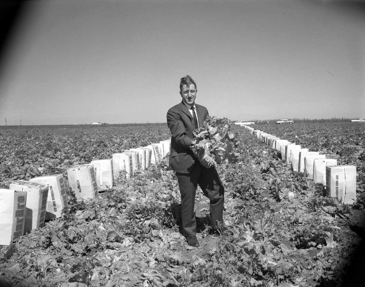 En esta foto de la década de 1960, Puzant Torigion sostiene con orgullo una caja de Bravo Smokes. La fotografía del fondo muestra un campo de lechugas. Bill Bradly / Cortesía de la Biblioteca del Condado de Deaf Smith