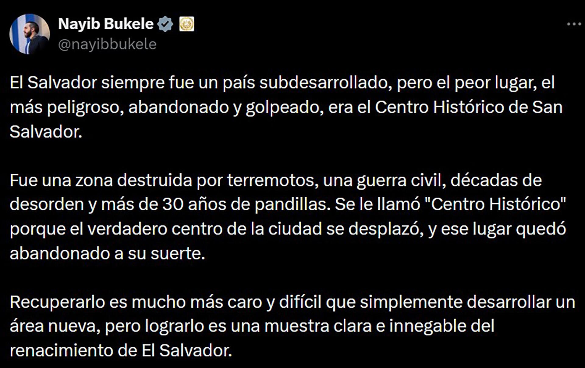 El mandatario Bukele remarcó en su publicación: “El Salvador siempre fue un país subdesarrollado, pero el peor lugar, el más peligroso, abandonado y golpeado, era el Centro Histórico de San Salvador”.
