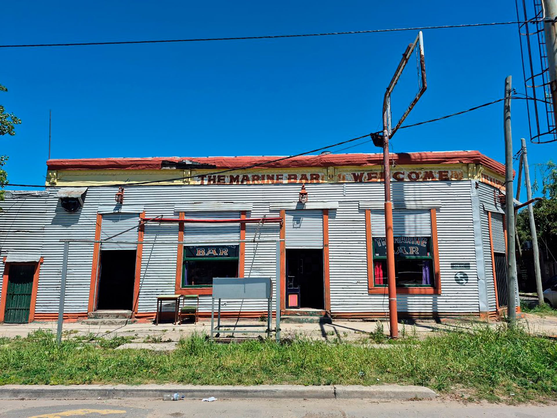 Durante una semana fuimos a diario hasta el Doque. Siempre tras una imagen espontánea de vida cotidiana. En cada esquina tenía la ilusión de toparme con un boliche que representara la vida portuaria del siglo XX. Cuando me estaba ganando la desilusión, en una de las tantas vueltas, terminamos frente al canal Dock Sud. Era por ahí. Por supuesto. Mi sueño se materializó y no era un espejismo. En la esquina de la Avenida Juan Díaz de Solís y el Pasaje Coronel Dreyer, cerrado pero de pie, me topé con un auténtico bar portuario. Un soberano “antro”: The Marine Bar.