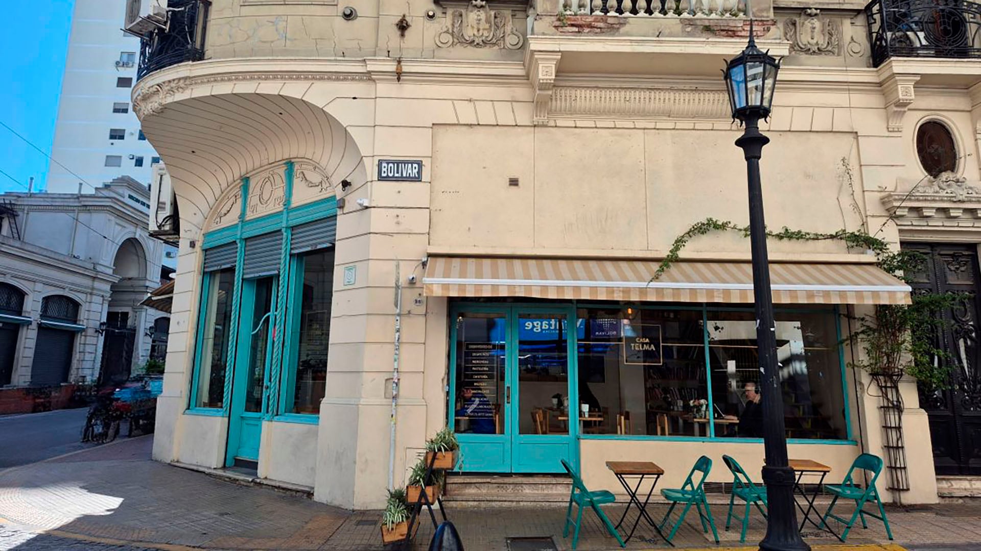 El tema de la feminidad es otro de los puntos de mi observación. En anteriores reseñas narré otros dos cafés abiertos y manejados por mujeres. Fueron el Citadino, de Parque Patricios, en manos de Analía, la formoseña. E Ifigenia, de la venezolana Isabela, que se mudó a fines de agosto de Villa General Mitre a San Telmo para situarse sobre Bolívar a 50 metros de Casa Telma. En los tres casos, se acentúa la mano de una mujer en la puesta. Otra señal perceptible del paso del tiempo. Los viejos cafés, duros, masculinos, hoy conviven con narrativas más cuidadas y de reconocible impronta femenina. Por ejemplo, en Casa Telma resalta el color aplicado en las carpinterías de hierro originales de la propiedad. “Se llama Joya de neptuno” contesta Camila, que también aclara que no fue su deseo esa tonalidad sino que, como siempre pasa, nunca coincide la elección de una carta de colores en la pinturería con el resultado final. Hoy, el color de la esquina es su sello y jamás se le ocurriría modificarlo.