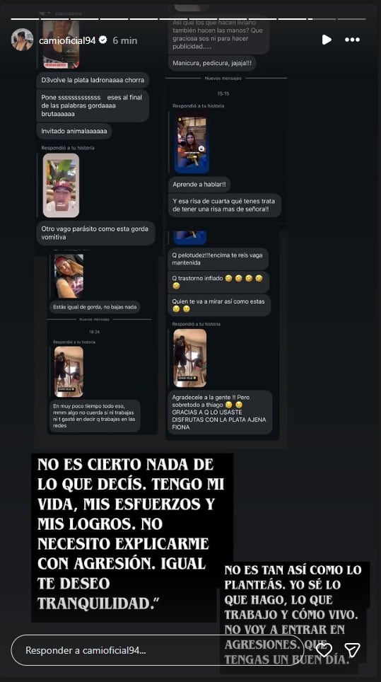Frente a estas nuevas acusaciones, Camila decidió hacer un descargo contundente exhibiendo algunos de los mensajes agresivos que recibió por privado y respondiendo con claridad. Todo comenzó al subir la captura de pantalla de los mensajes que una misma persona le envió a lo largo del día, remarcó: “No es cierto nada de lo que decís. Quedate tranquilo, yo tengo mi vida, mis esfuerzos y mis logros. No necesito explicarme con agresión. Igual te deseo tranquilidad”. Y agregó en otro fragmento: “No es tan así como lo planteás. Yo sé lo que hago, lo que trabajo y cómo vivo. No voy a entrar en agresión, solo espero que tengas un día bendecido”.