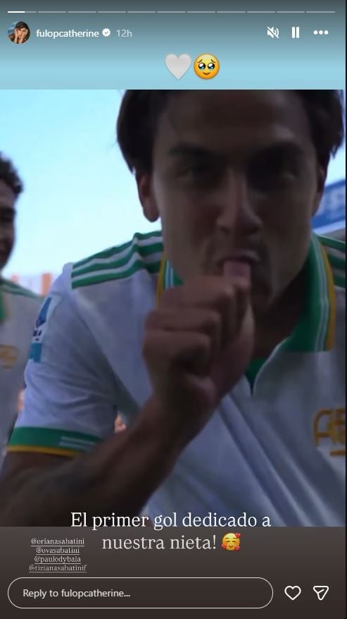 La actriz y conductora publicó en sus historias de Instagram dos videos del festejo, acompañados por un emoji de corazón y una carita llorando de emoción. “El primer gol dedicado a nuestra nieta”, escribió con ternura, etiquetando a Oriana Sabatini, Paulo Dybala, Ova Sabatini y Tiziana Sabatini.
