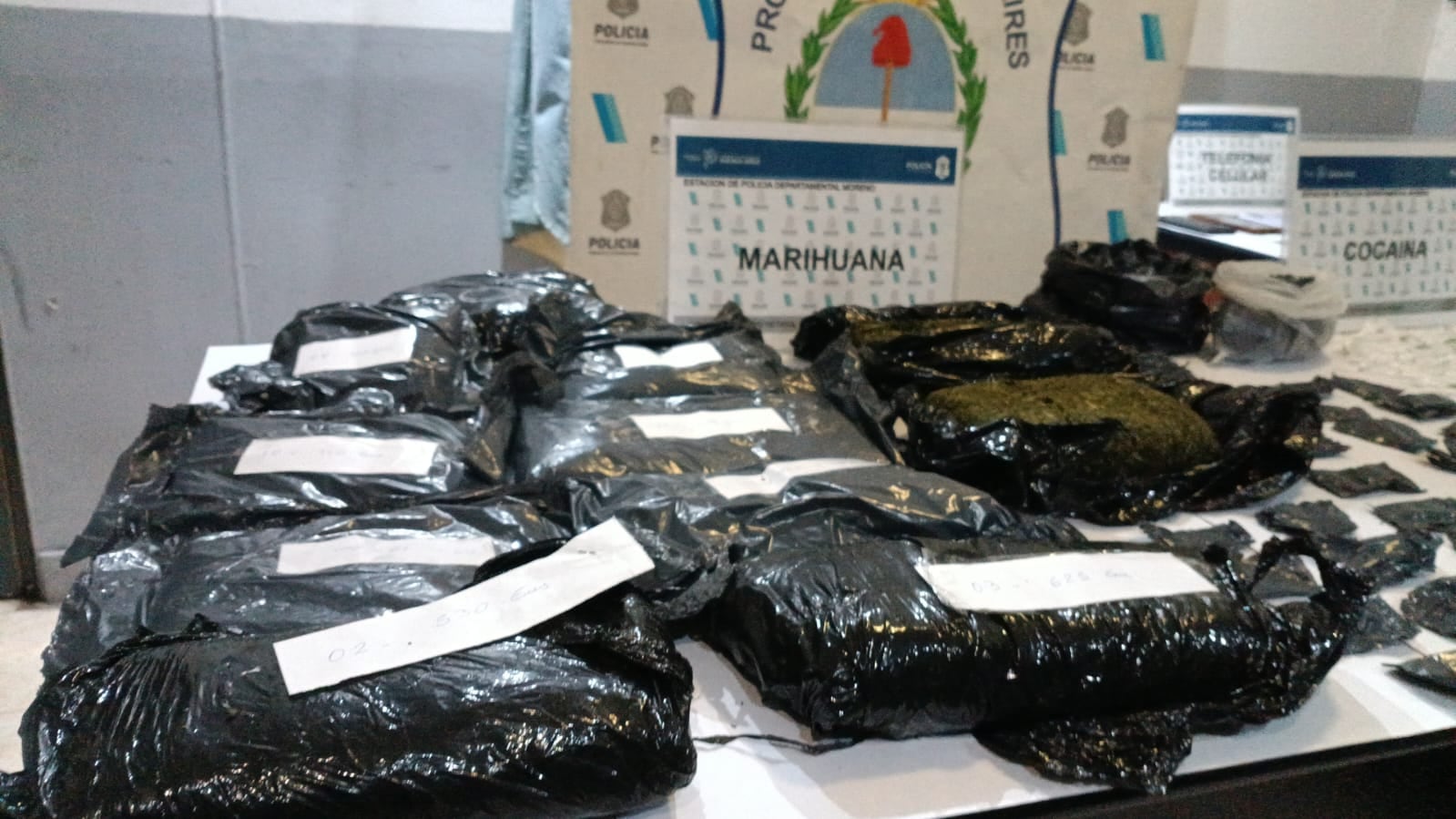 En uno de los domicilios allanados en Moreno, las fuerzas de seguridad detuvieron a Díaz y a otros dos integrantes de la banda. Allí incautaron 72 envoltorios de marihuana con un peso total de 105 gramos, 186 envoltorios de cocaína (71,19 gramos), recortes de nylon utilizados para el fraccionamiento de las sustancias, tres tijeras, una balanza de precisión, dos teléfonos celulares y 146.950 pesos en efectivo.