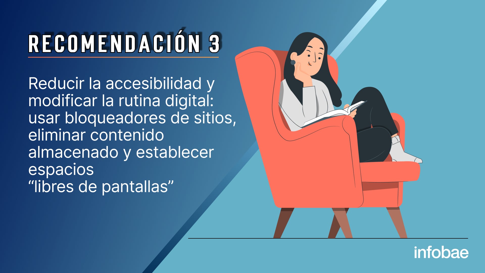 Se recomienda implementar herramientas como bloqueadores de sitios, eliminar contenido almacenado y establecer horarios o espacios “libres de pantallas”. No se trata de prohibición aislada, sino de reducir el acceso automático para fortalecer el control voluntario.