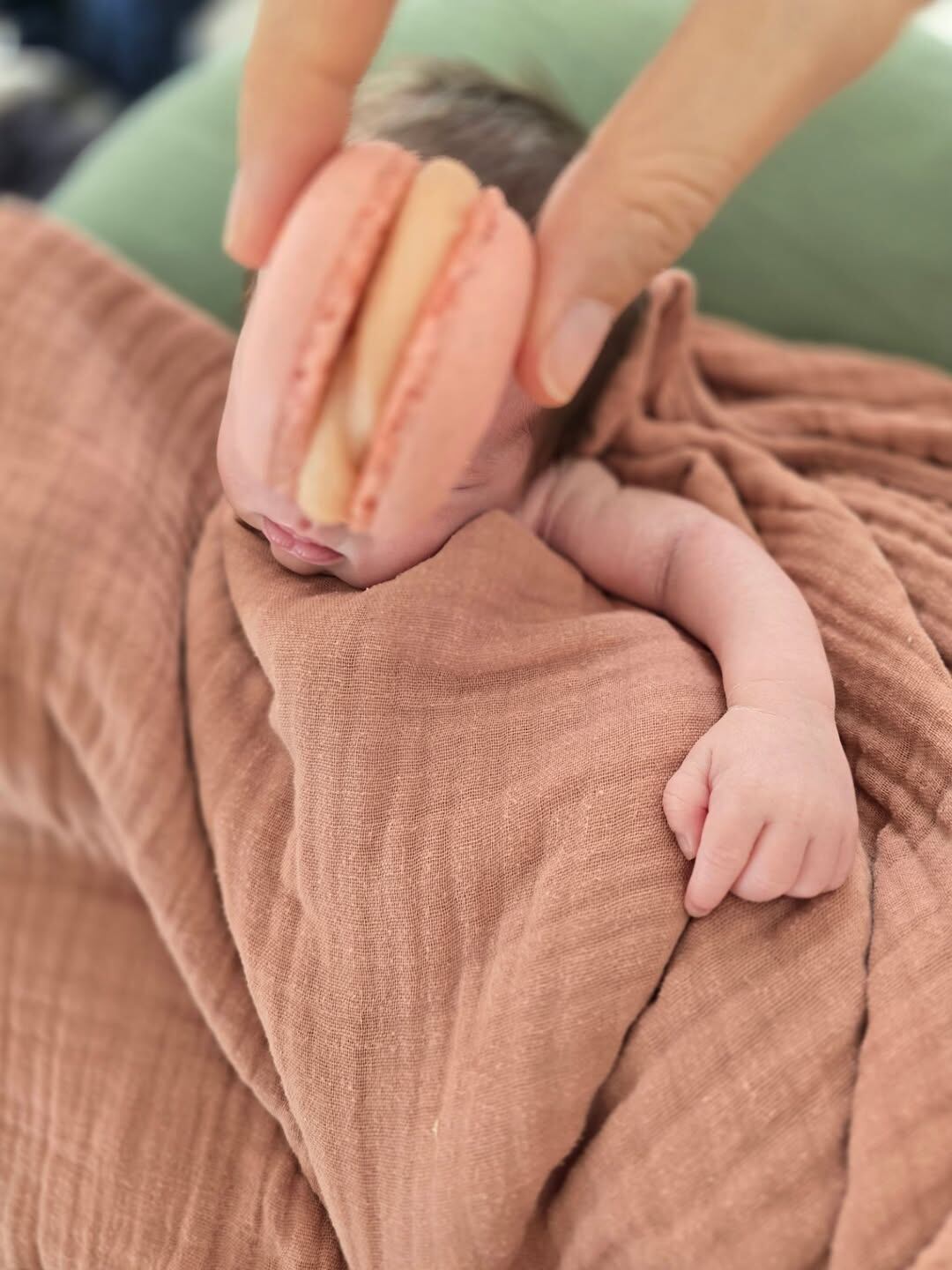 Las fotos que acompañan el relato muestran, además, momentos de intimidad y los pequeños grandes detalles del nacimiento. En una de ellas, el recién nacido aparece envuelto en una manta color terracota, con el rostro semioculto y la mano de un adulto sosteniendo un macarron sobre su frente, mientras la cabecita de Gael y su mano izquierda apenas asoman. Otra imagen muestra los pequeños pies del bebé envueltos en una manta beige, uno de ellos con la pulsera identificatoria escrita a mano con su nombre. La calidez lumínica y los tonos suaves de la escena refuerzan el clima de bienvenida, protección y ternura.