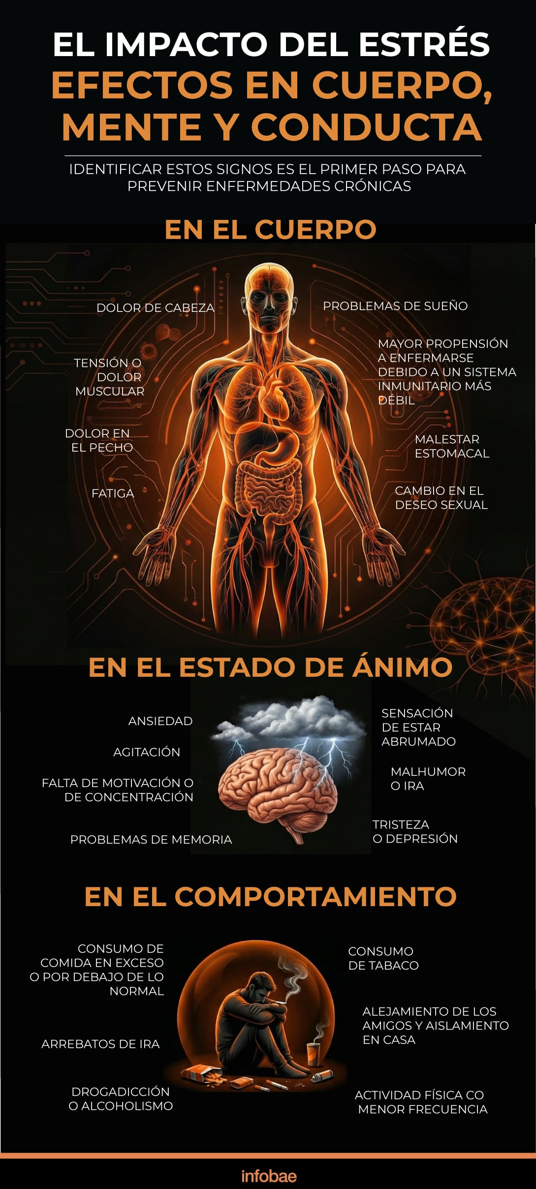 Los síntomas del estrés pueden afectar el cuerpo, los pensamientos y sentimientos, y el comportamiento.