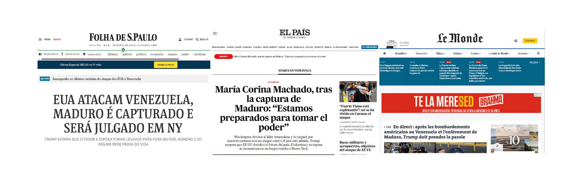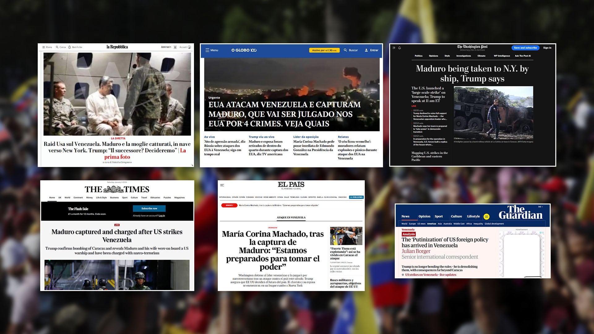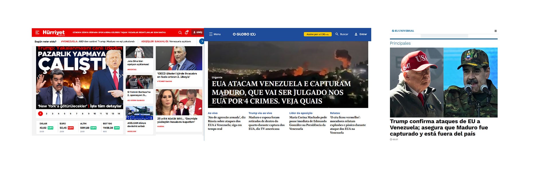 El Tiempo, de Colombia, país que limita con Venezuela igual que Brasil, destaca que Trump pudo ver en “tiempo real” la captura de Maduro y otra nota de su “Unidad investigativa” revela que “Maduro intentó refugiarse en un búnker blindado”. En tanto que El Universal, el diario más tradicional de México elige la frase de Trump “vamos a dirigir el país” para encabezar sus titulares.