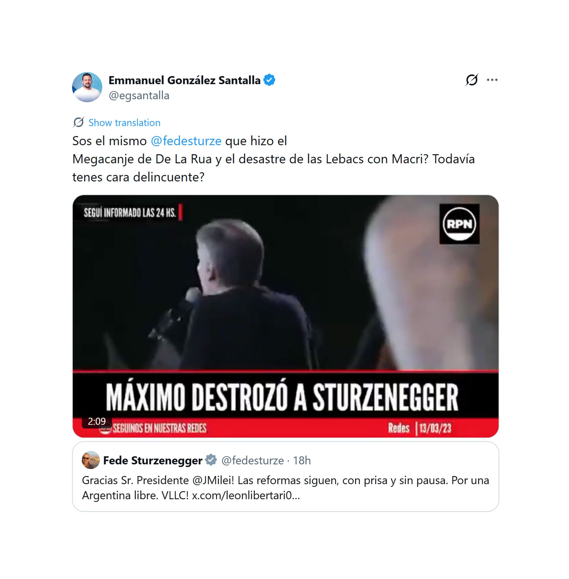 La publicación generó reacciones inmediatas en el ámbito político, especialmente entre representantes de La Cámpora, quienes asumieron la caricatura como una interpelación directa a la agrupación fundada por Máximo Kirchner. En respuesta, desde las redes sociales del espacio se difundió un video de archivo con fragmentos de un discurso de Kirchner, en el que se evocan antecedentes judiciales de Sturzenegger y su desempeño en gestiones anteriores. En el registro, el diputado señala: “Sturzenegger tuvo una causa que el partido judicial hamacó y apuró durante años por el desfalco cometido contra la Argentina y sus ahorristas. Fue la compañera, hoy vicepresidenta, aquella que con el Boden 2012, que con el Boden 2015, devolvió gran parte de los ahorros a los argentinos y argentinas, mientras Sturzenegger, dos años después, volvería a hundir a la Argentina”.