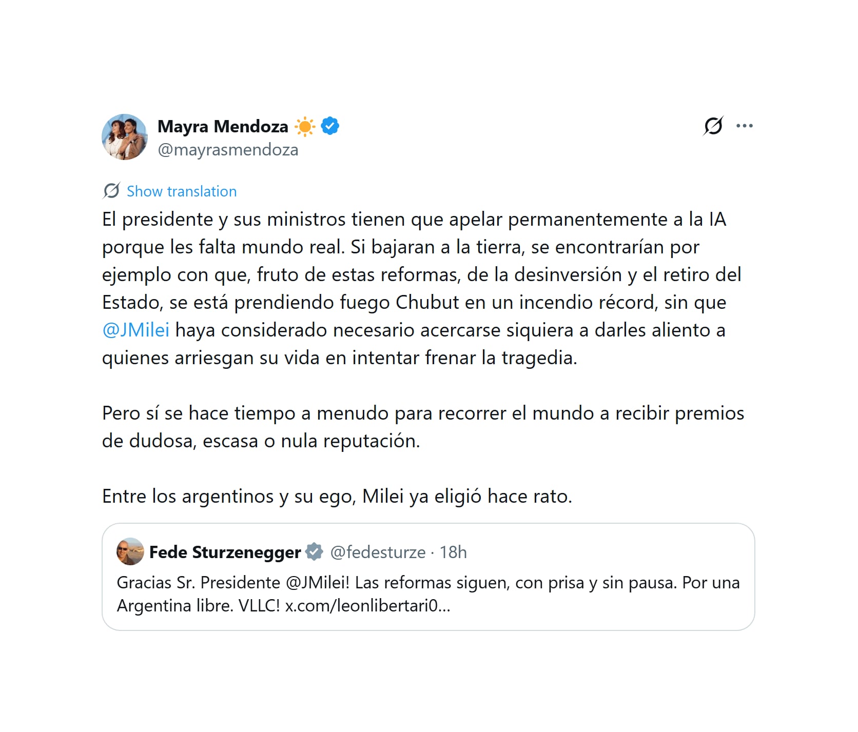 “El presidente y sus ministros tienen que apelar permanentemente a la IA porque les falta mundo real. Si bajaran a la tierra, se encontrarían por ejemplo con que, fruto de estas reformas, de la desinversión y el retiro del Estado, se está prendiendo fuego Chubut en un incendio récord, sin que @JMilei haya considerado necesario acercarse siquiera a darles aliento a quienes arriesgan su vida en intentar frenar la tragedia”, cuestionó la funcionaria, cercana a Cristina y Máximo Kirchner.