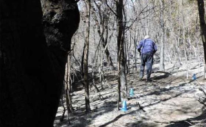La reconstrucción del siniestro permitió identificar el “punto cero” del incendio. Los peritos localizaron el origen en la base de una pitra —un árbol nativo de cinco troncos— que presentaba daños por fuego mucho más profundos que el resto de la vegetación circundante. Las marcas de quemaduras en los árboles cercanos confirmaron que el fuego comenzó en ese lugar específico.