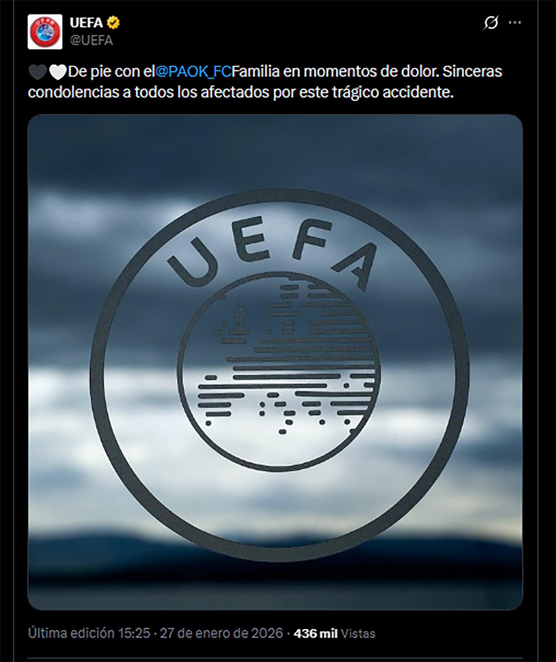 La noticia ha generado muestras de pesar en el ámbito deportivo europeo. La Unión de Asociaciones Europeas de Fútbol (UEFA) emitió un mensaje de condolencia: “acompañando a la familia PAOK en este momento de dolor. Nuestro más sentido pésame a todos los afectados por este trágico accidente”, publicó la organización en sus redes sociales.