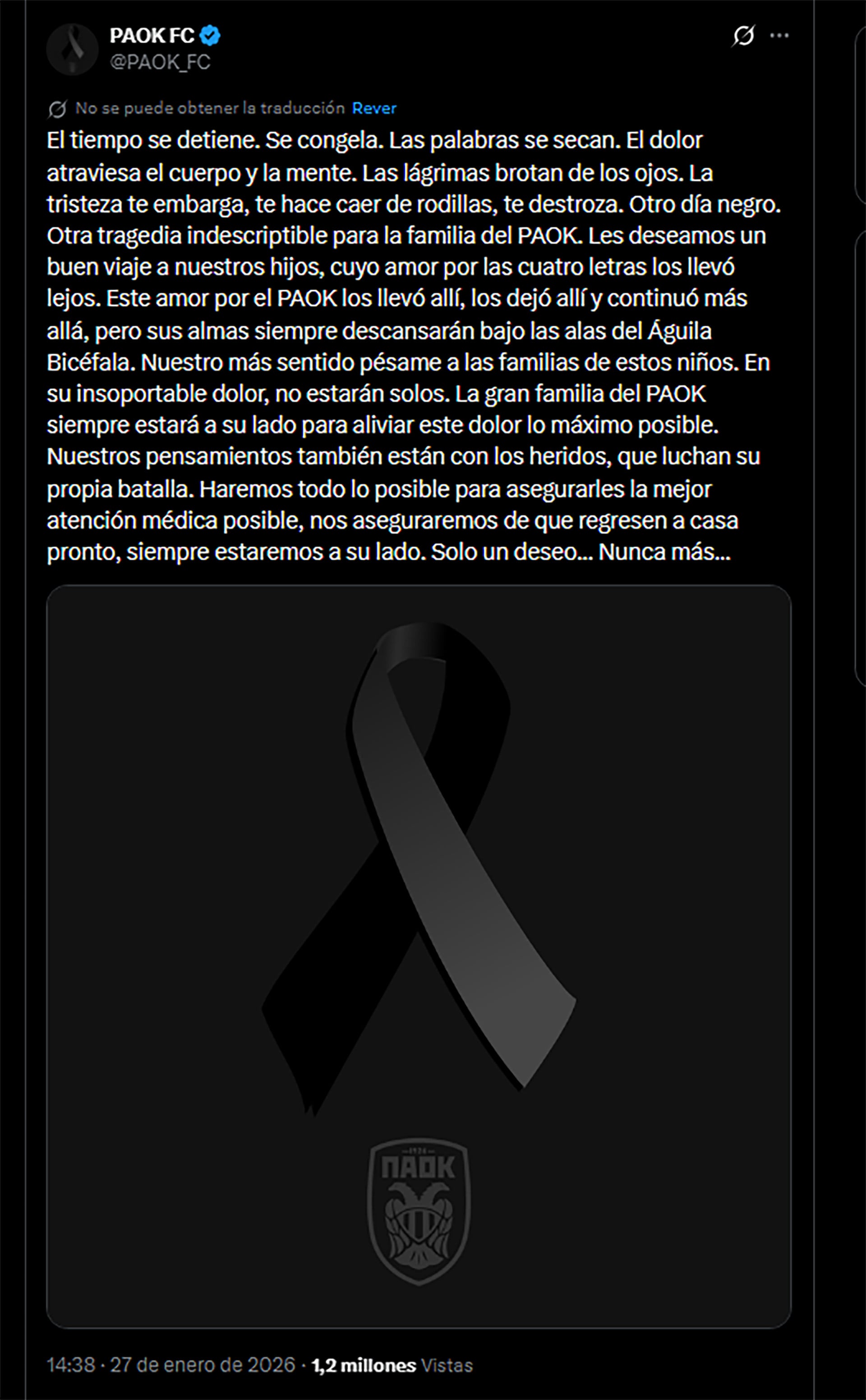 El propio PAOK compartió un comunicado en el que reflejó el impacto emocional: “El tiempo se detiene. Se congela. Las palabras se secan. El dolor atraviesa el cuerpo y la mente. Las lágrimas brotan de los ojos. La tristeza te embarga, te hace caer de rodillas, te destroza. Otro día negro. Otra tragedia indescriptible para la familia del PAOK…”.