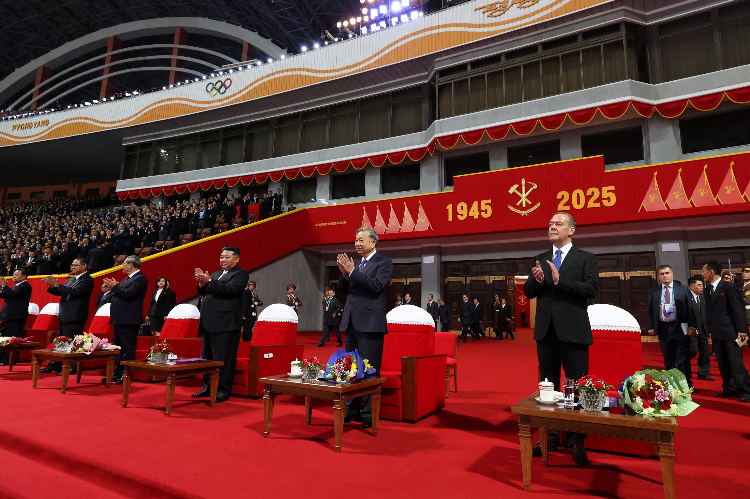 El dictador norcoreano Kim Jong-un, el secretario general del Partido Comunista de Vietnam, To Lam, y el vicepresidente del Consejo de Seguridad ruso y líder del partido político Rusia Unida, Dmitri Medvedev, asistieron a un acto conmemorativo del 80º aniversario de la fundación del Partido de los Trabajadores de Corea (WPK) en Pyongyang el 9 de octubre de 2025 (Sputnik/Yekaterina Shtukina/REUTERS)