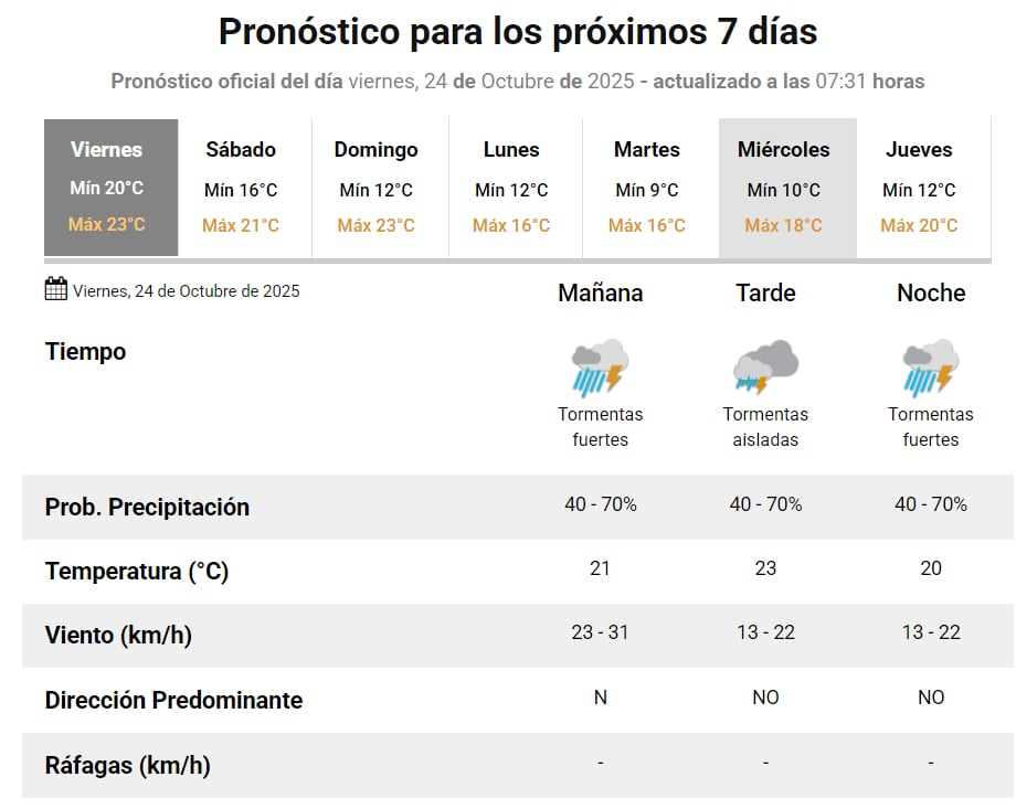 Según el Servicio Meteorológico Nacional (SMN), luego de las tormentas previstas para hoy y mañana, el tiempo se estabilizará en el AMBA de cara a los comicios. Aunque la temperatura no alcanzará valores típicos de primavera, se espera una jornada templada, con una máxima de 23 °C y una mínima de 12 °C.