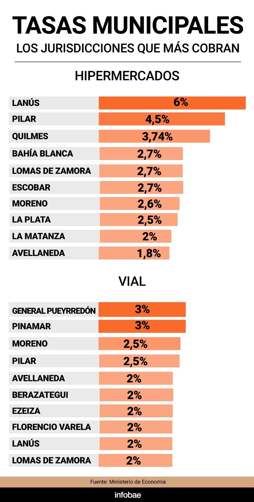 Es el caso de Lanús, donde la alícuota alcanza el 6%. “Los vecinos de Lanús, padeciendo la inoperancia de su intendente, pagan precios más altos que en otros municipios. Bien los supermercados explicitando que la suba es sólo en Lanús”, había manifestado Caputo en septiembre del año pasado, luego de que grandes cadenas colocaran carteles en la puerta de sus establecimientos avisando a los clientes que tuvieron aumentar sus productos por un ajuste del 3,3% en la tasa.