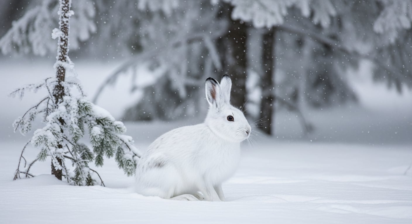 La liebre raqueta de nieve presenta un camuflaje tan efectivo que rara vez se deja ver, aunque sus huellas delatan su paso sobre la nieve profunda gracias a sus grandes patas traseras.