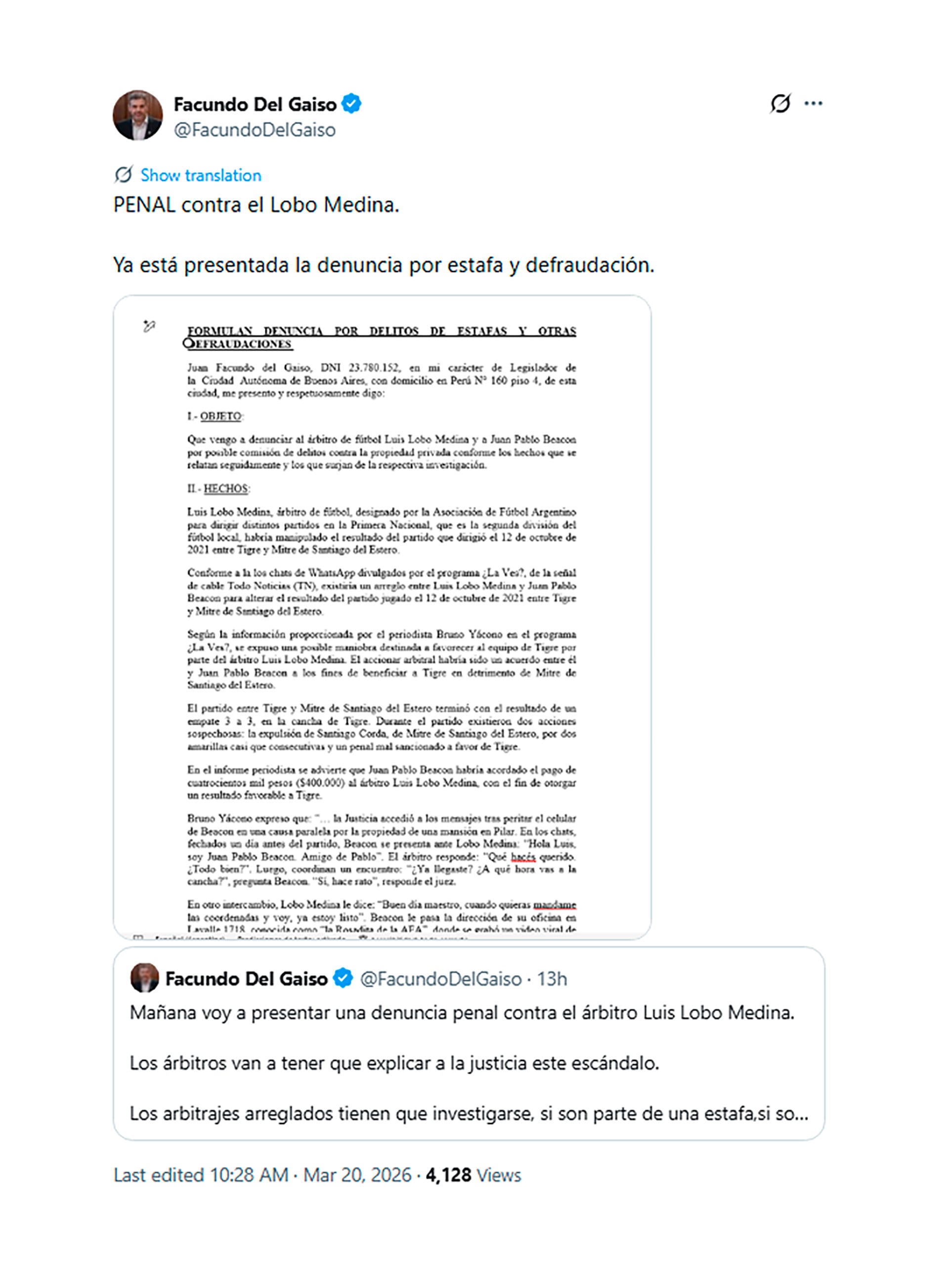 El diputado por la Ciudad de Buenos Aires subraya a partir de estos mensajes: “El accionar arbitral habría sido un acuerdo entre él y Juan Pablo Beacon a los fines de beneficiar a Tigre en detrimento de Mitre de Santiago del Estero”. Al mismo tiempo, remarca que en este informe periodístico se advierte que “Juan Pablo Beacon habría acordado el pago de cuatrocientos mil pesos ($400.000) al árbitro Luis Lobo Medina, con el fin de otorgar un resultado favorable a Tigre”.