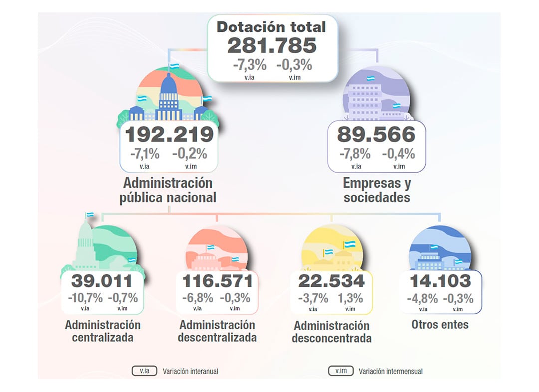 Al cierre de noviembre de 2025, la dotación total del sector público nacional —que incluye la administración pública nacional, las empresas y las sociedades del Estado— se ubicó en 281.785 personas, según datos publicados por el Indec. Ese nivel implicó una baja intermensual del 0,3% respecto de octubre y una caída interanual del 7,3%, de acuerdo con los datos oficiales.