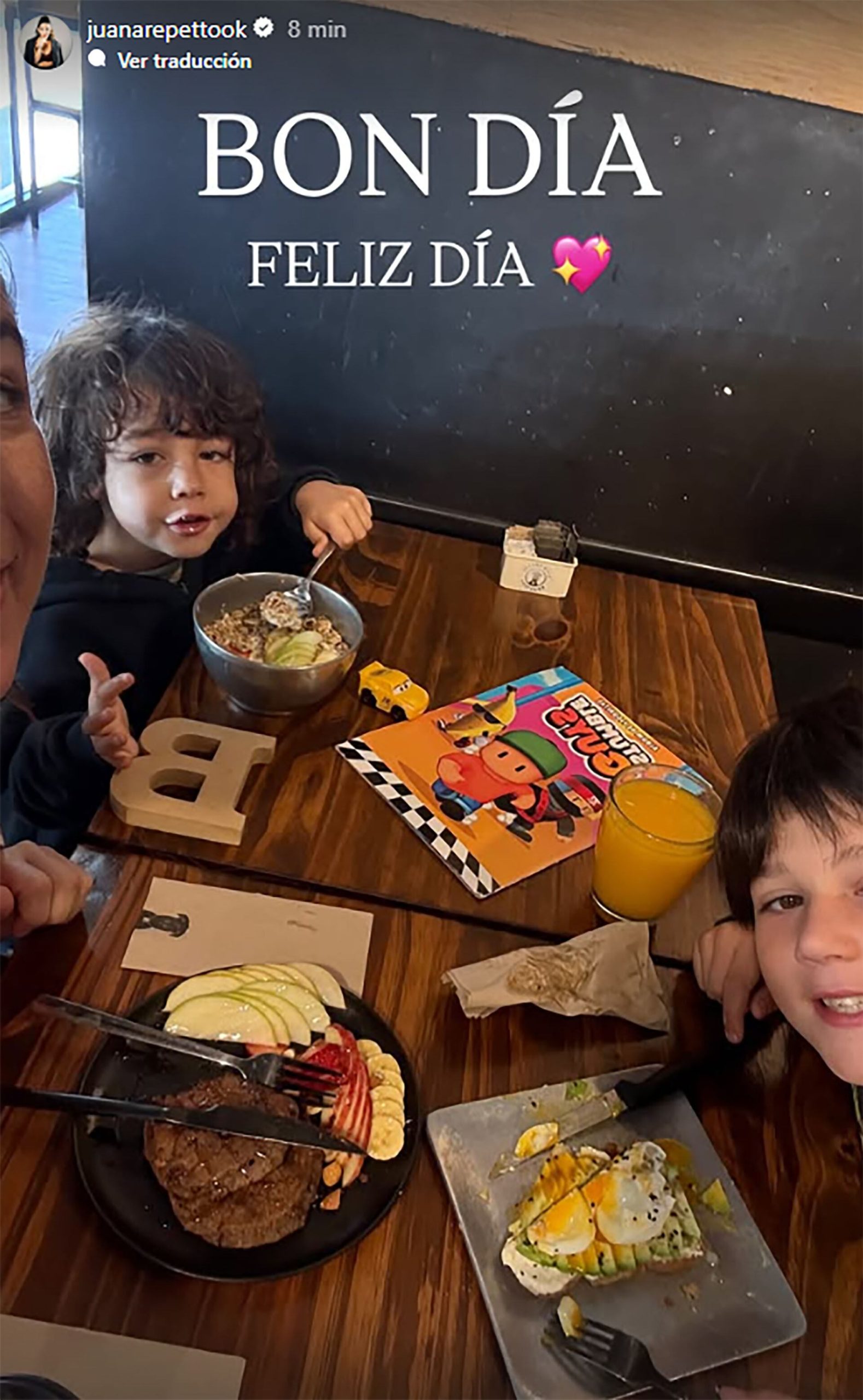 Juana Repetto fue una de las primeras en publicar en sus redes. La actriz y conductora eligió una escena sencilla, cercana y sincera para abrir el día: sentada a la mesa de una cafetería en compañía de sus hijos, mostró los platos del desayuno y sumó el mensaje “BON DÍA. FELIZ DÍA”. Una instantánea fresca y real, que celebró la maternidad en los pequeños detalles y la plenitud de saber que son esos ratos los que hacen toda la diferencia.