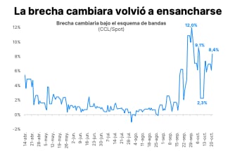 La tensión cambiaria, con firme demanda dolarizadora a pocos días de las elecciones legislativas, se traslada también a los negocios bursátiles, donde el “contado con liquidación” mediante bonos opera a $1.603, unos 114 pesos o 10,5% por encima del tipo de cambio oficial, ahora en los $1.089 y contenido cerca del techo de las bandas de flotación.
