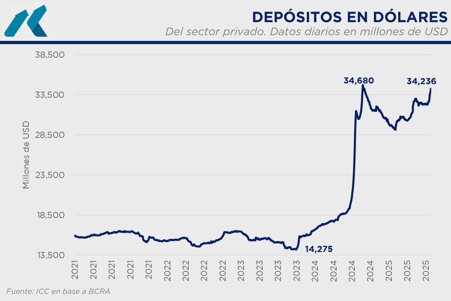 Un reporte de Iván Carrino Consulting indicó que “los depósitos en dólares alcanzaron un máximo para el año: USD 34.236 millones al inicio de octubre. El máximo histórico se alcanzó en octubre de 2024, tras el fin del blanqueo”, en los USD 34.680 millones..