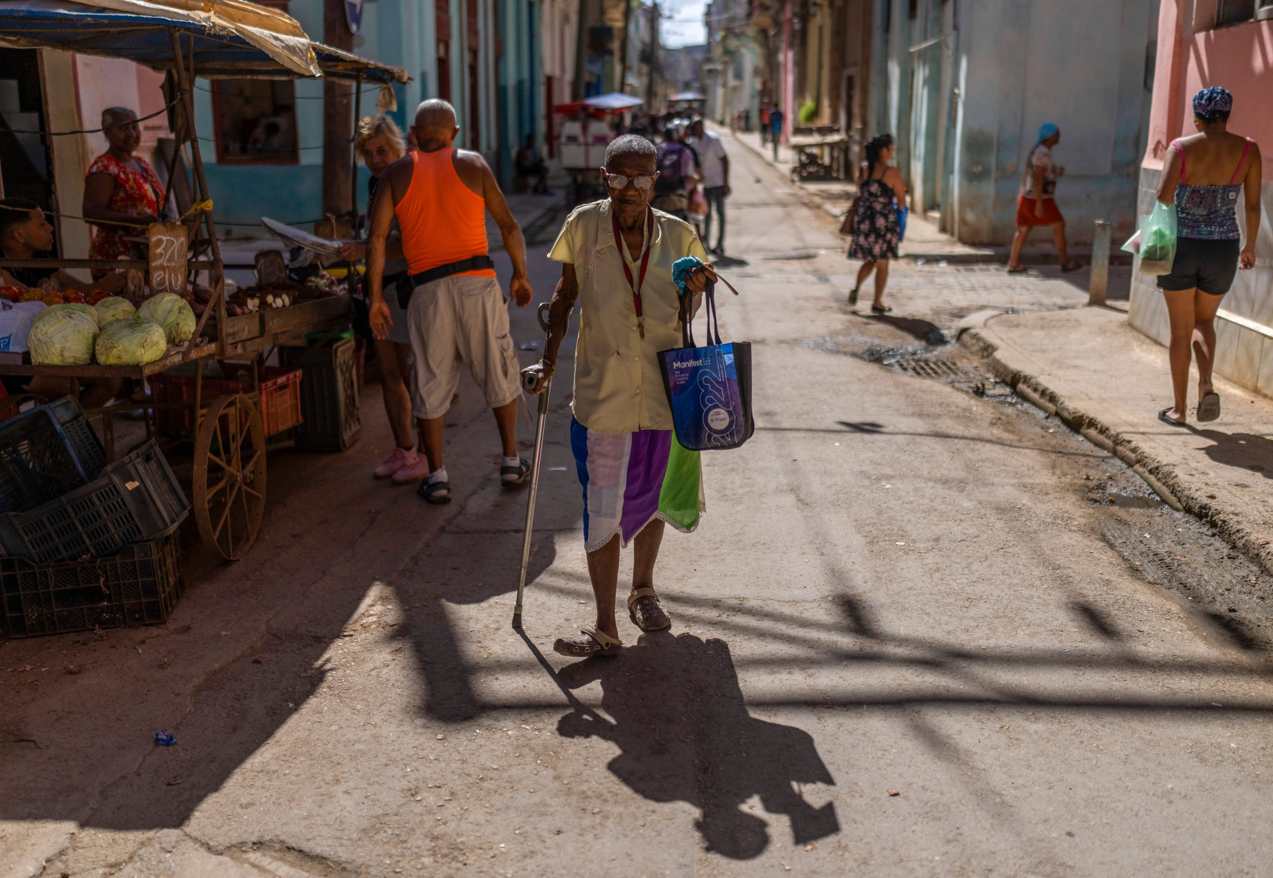 Una mujer camina con la ayuda de un bastón en La Habana Vieja, el viernes 14 de febrero de 2025 (Foto AP/Ramón Espinosa)