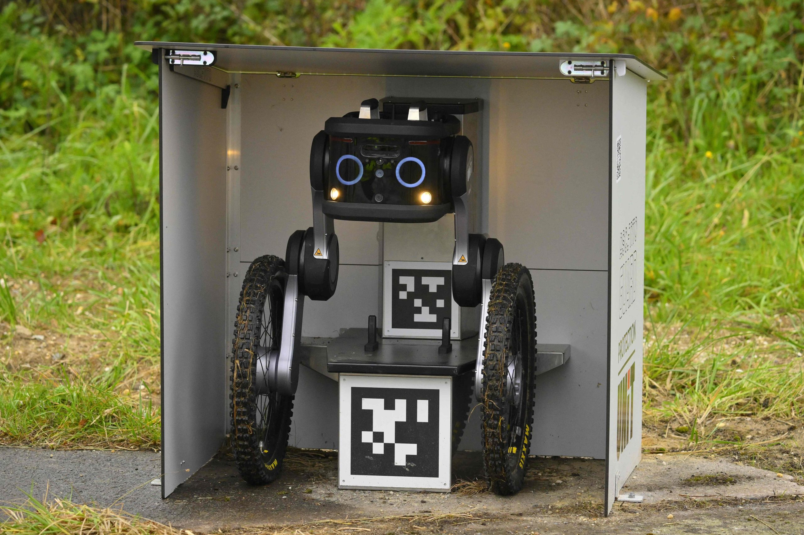 El robot Suricata en una demostración para la prensa en el aeropuerto de Lieja este 30 de septiembre de 2025 (JOHN THYS / Belga / AFP)