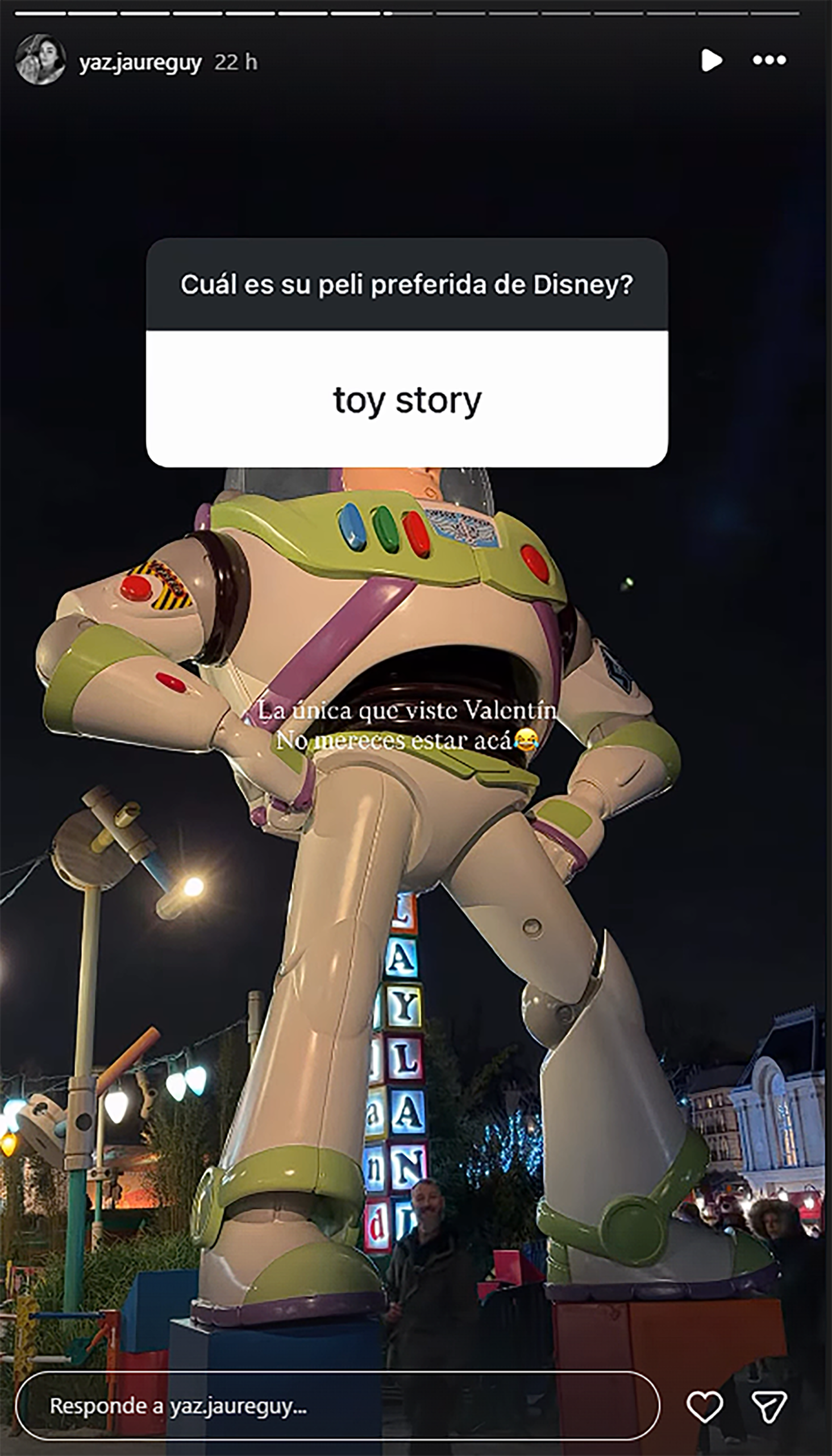 A continuación, habilitó la función de Instagram para recibir preguntas de sus seguidores sobre cuál era la película favorita de Disney de cada usuario. Eso le permitió publicar postales relacionadas a La bella y la bestia y Rapunzel. Además, le hizo una chicana a su pareja cuando le mencionaron Toy Story: “La única que viste Valentín. No mereces estar acá”. Y lo acompañó de un emoticón de una carita riéndose.