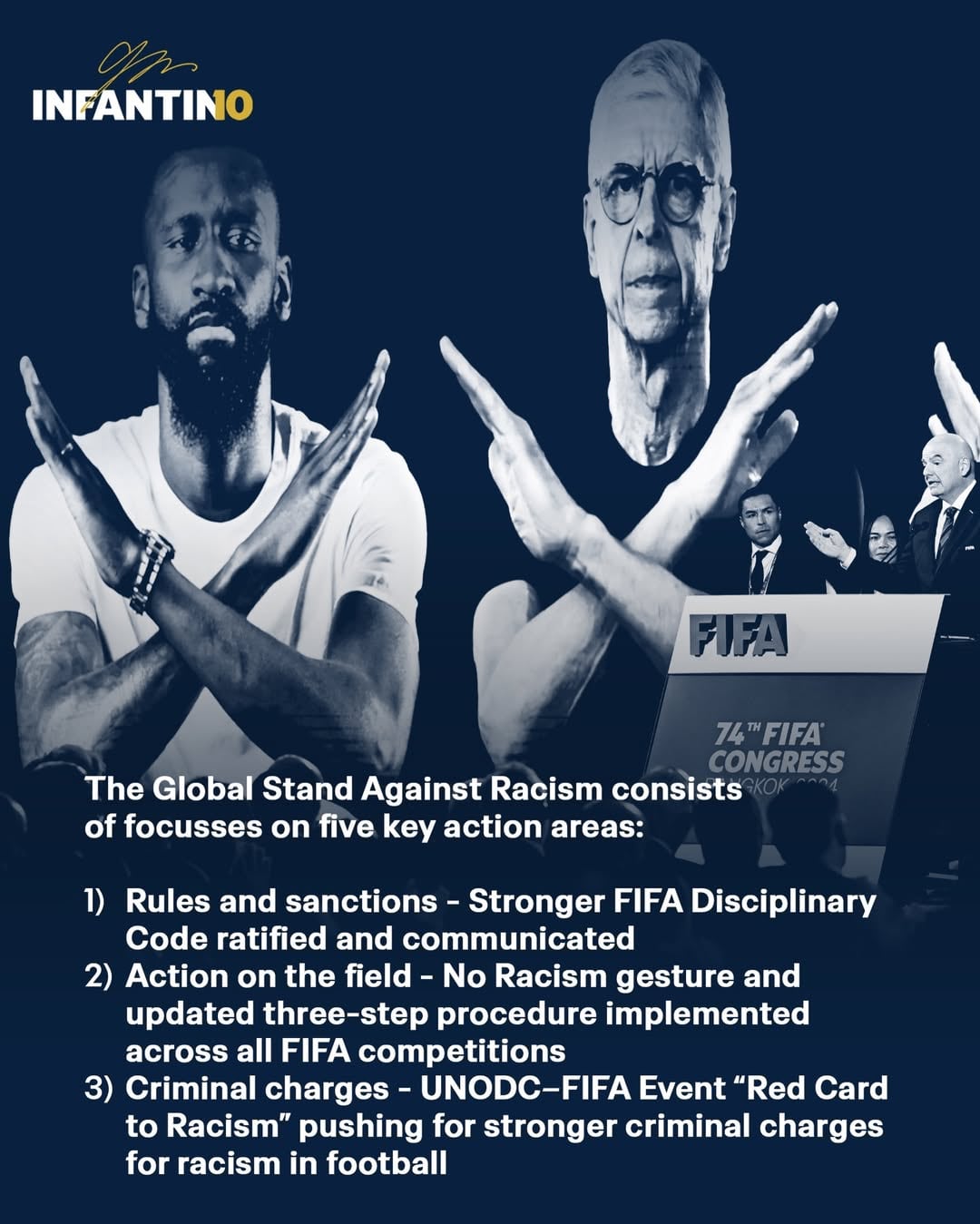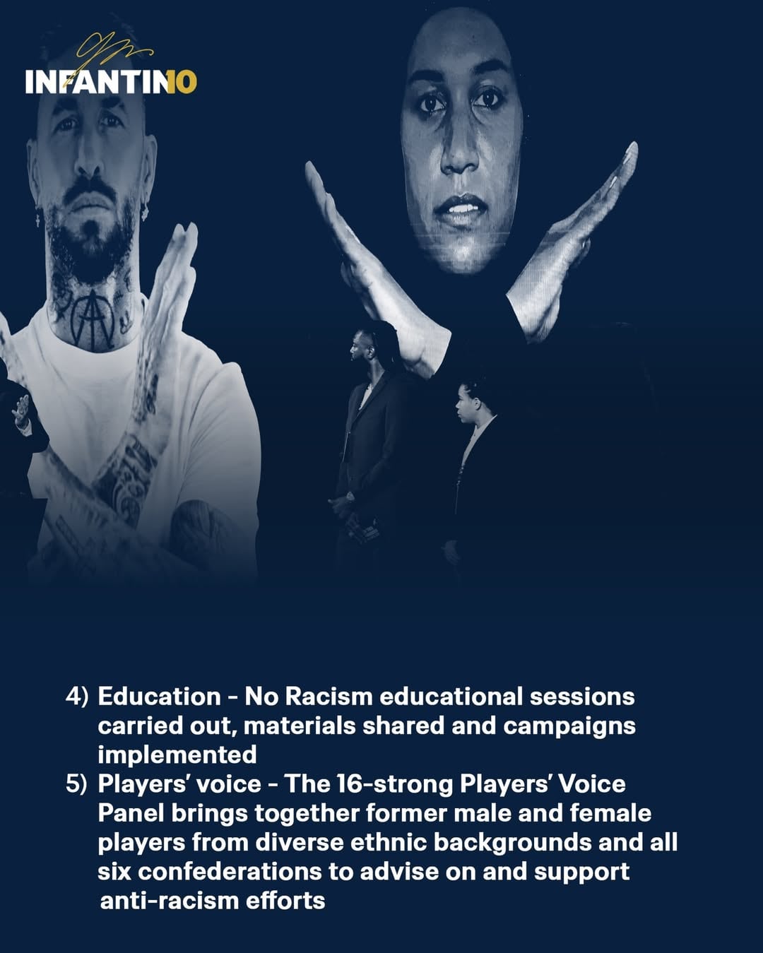 Desde su elección como Presidente de la FIFA en 2016, nuestro grupo directivo asumió colectivamente su responsabilidad como guardianes del deporte más amado y seguido del mundo para utilizar el poder único del fútbol para promover la inclusión y combatir la lacra del racismo y todas las formas de discriminación, dentro y fuera de la cancha.