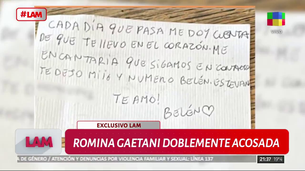 En LAM (América TV) dieron detalles de quién es la mujer que Gaetani denunció: la acosadora, nacida en 1994, comenzó a acercarse a la actriz como fan, asistiendo con frecuencia al teatro y a funciones donde la artista se presentaba. “Es una fan que se acerca, que va al teatro muy seguido a verla… Pero después empezó con una actitud invasiva que le empezó a incomodar”, detalló Pilar Smith al reconstruir el testimonio de la actriz. En su denuncia Gaetani contó las actitudes que encendió su alarma: “Por ejemplo, se mete al teatro y después me agarra fuerte del brazo, se quiere meter en mi auto cuando yo me estoy yendo”.