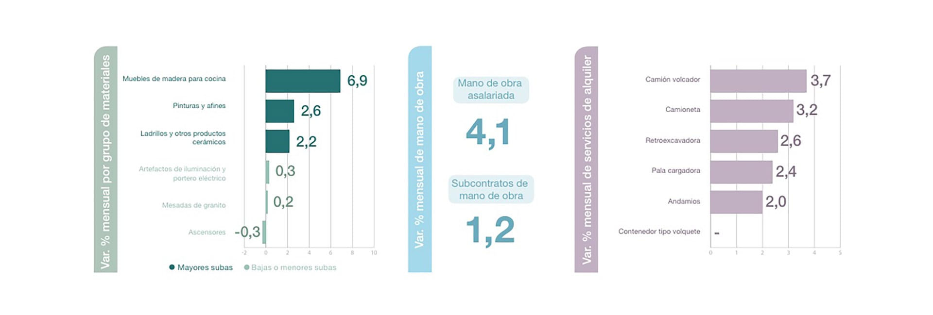 En el desagregado de materiales, el informe mostró aumentos mensuales destacados en muebles de madera para cocina (6,9%), pinturas y afines (2,6%), ladrillos y otros productos cerámicos (2,2%) y aberturas metálicas y rejas (2,1%). Entre las menores variaciones del mes se ubicaron los ascensores, con una baja de 0,3%, las mesadas de granito (0,2%) y los artefactos de iluminación y portero eléctrico (0,3%).