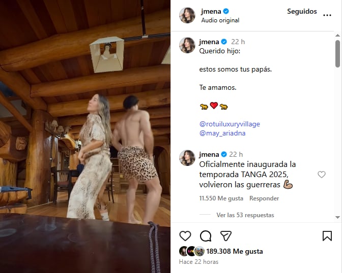 El video comienza con ambos frente a la cámara, listos para moverse. Mientras suena un poco de funk brasileño, ambos se ponen a perrear, hasta que Jimena, entre carcajadas, le sugiere a su pareja: “Pero ponete atrás”. La respuesta de él, con la misma liviandad, corta el paso con un guiño paternal: “Pero está la criatura”. Ese pequeño diálogo define el tono: hay juego, hay improvisación y una dinámica de pareja que se anima a reírse de sí misma. Al posteo lo acompaña una frase que refuerza esa mirada doméstica y entrañable: “Querido hijo: estos somos tus papás. Te amamos”. El remate, horas más tarde, coronó la escena con marca propia: “Oficialmente inaugurada la temporada TANGA 2025, volvieron las guerreras”.