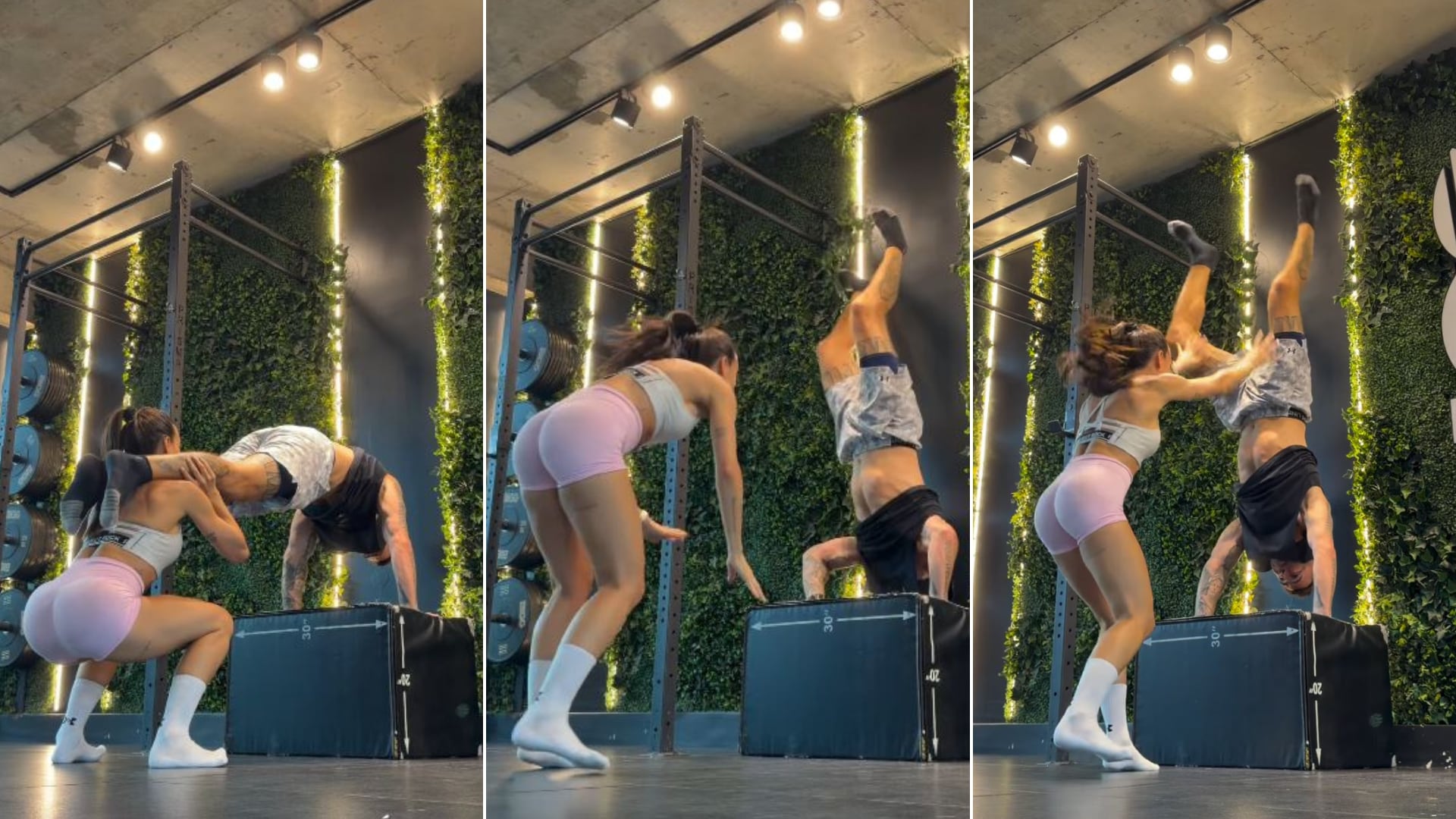 El objetivo del ejercicio era que Guido se pusiera de cabeza sobre el cajón, como si hiciera una vertical. Fue entonces cuando Sol hizo una sentadilla e impulsó las piernas de su pareja hacia el aire. Sin embargo, la fuerza fue tal que Mazzoni no logró mantener el equilibrio, golpeó sus pies contra la pared y terminó cayendo.