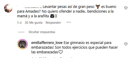 Sin embargo, no todos fueron mensajes de apoyo. Algunos seguidores pusieron en duda la seguridad de su rutina y le dejaron comentarios como: “¿Levantar pesas así es bueno para el bebé?” o “Ay, qué miedo, estas mujeres embarazadas que hacen gimnasia”. En los comentarios de su publicación, una usuaria le preguntó: “¿Levantar pesas así de gran peso es bueno para Amadeo? No quiero ofender a nadie… bendiciones a la mamá y a la arañita”.