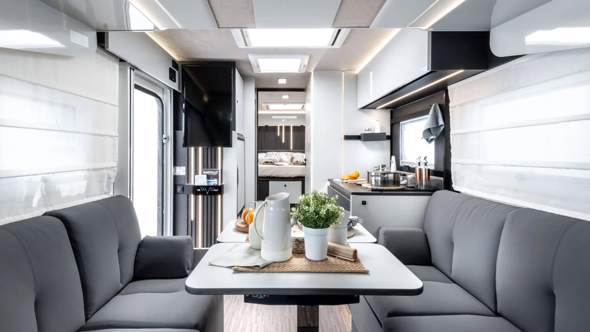 El vehículo ofrece un interior espacioso y configurable, con un gran salón enfrentado, ambiente luminoso gracias a amplias ventanas y detalles funcionales enfocados en la ergonomía. La cocina cuenta con generosos espacios de almacenamiento, mientras que los dormitorios presentan acabados de calidad como estores, revestimiento soft-touch, altavoces y colchones de alto nivel sobre somieres de láminas. El baño, decorado con madera y superficie laminada opaca, dispone de compartimentos ocultos y espejo con almacenamiento adicional. El garaje tiene capacidad de carga de hasta 300 kg e incluye seis anillas de fijación, compartimentos resellables y dos rejillas de vaciado en el suelo. El valor de este motorhome ronda los 100.000 dólares.
