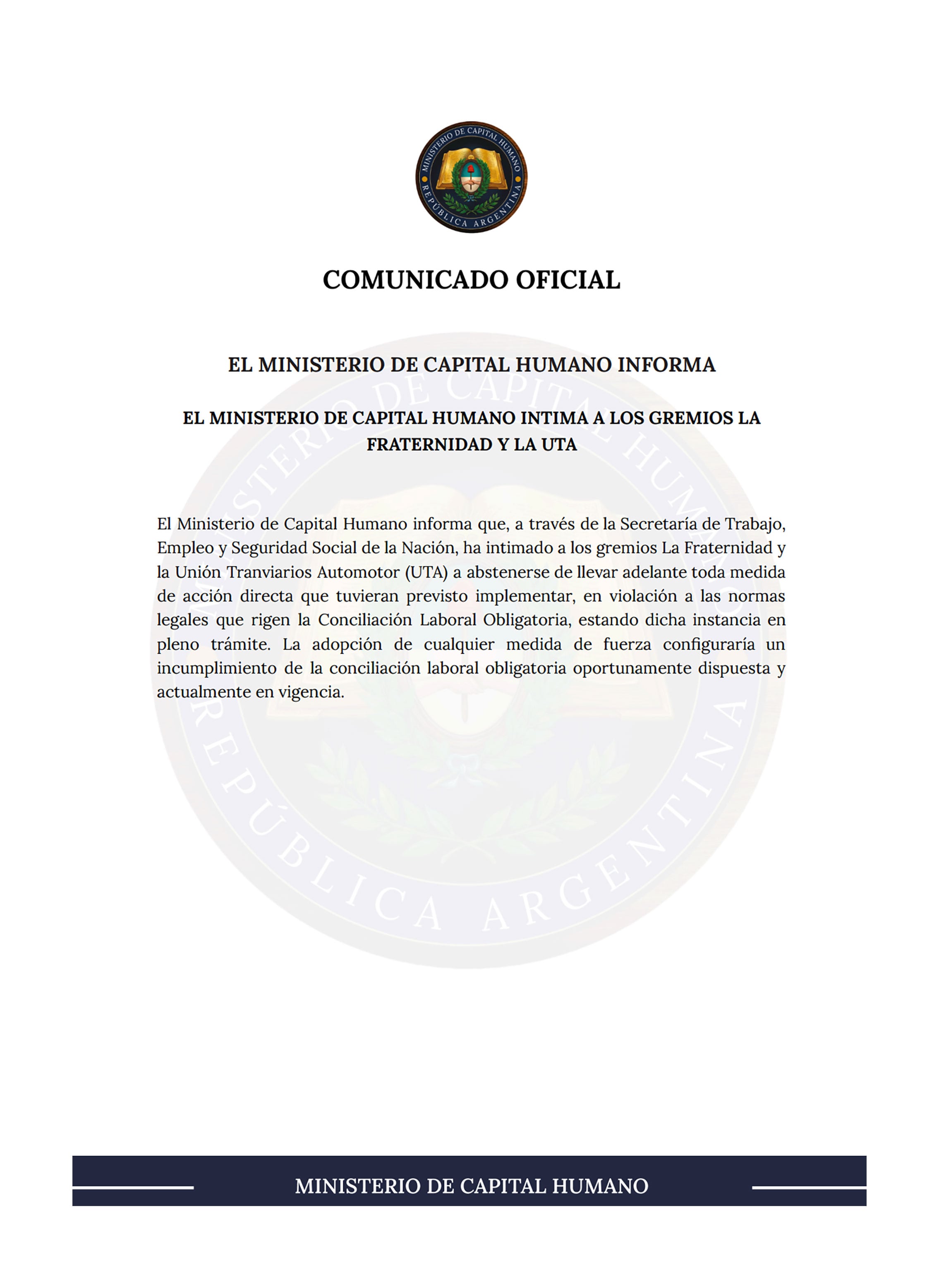El Ministerio de Capital Humano informó que intimó a La Fraternidad y a la Unión Tranviarios Automotor (UTA) a abstenerse de realizar medidas de fuerza mientras se encuentra vigente el proceso.