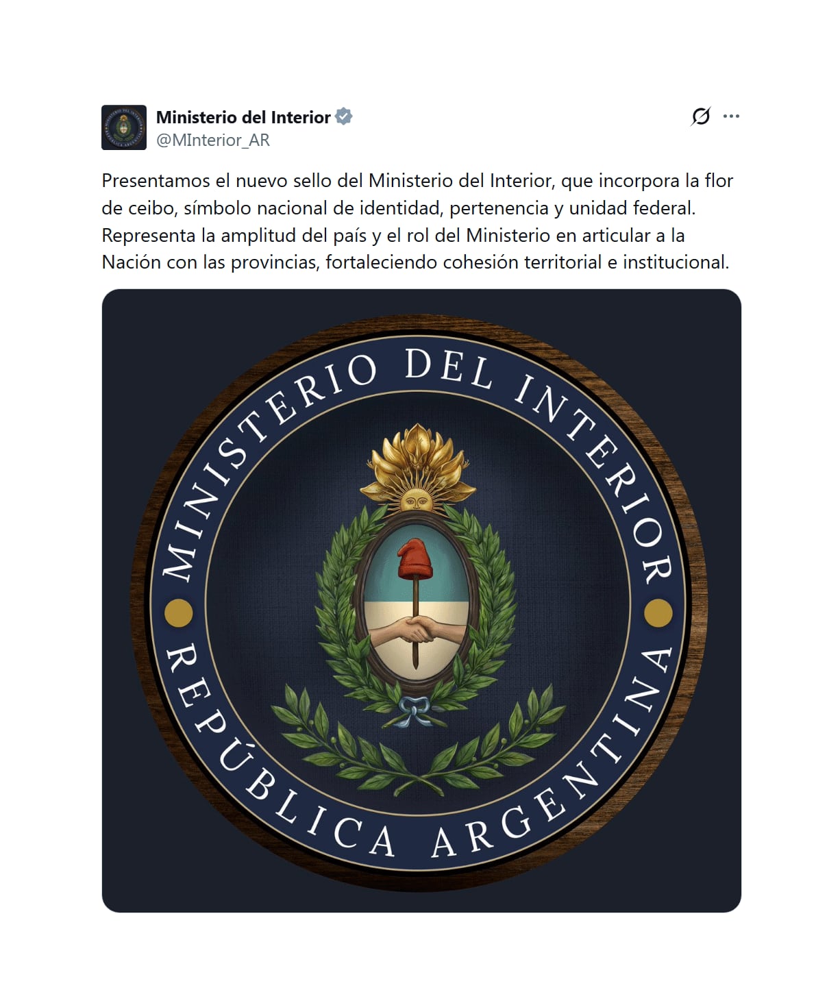 Sumado a estas dos últimas, con el ingreso de Diego Santilli al Ministerio de Interior incorporaron la “flor de ceibo, símbolo nacional de identidad, pertenencia y unidad federal. Representa la amplitud del país y el rol del Ministerio en articular a la Nación con las provincias, fortaleciendo cohesión territorial e institucional”.