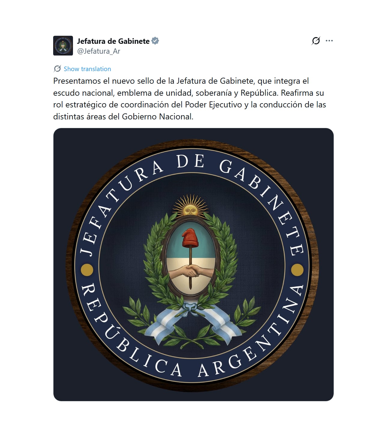 Uno de los primeros que se conoció fue el de la Jefatura de Gabinete, que estará a cargo de Manuel Adonri. La cartera central del Gabinete tendrá el escudo nacional, “emblema de unidad, soberanía y República. Reafirma su rol estratégico de coordinación del Poder Ejecutivo y la conducción de las distintas áreas del Gobierno Nacional”, señalaron en el comunicado desde Presidencia.
