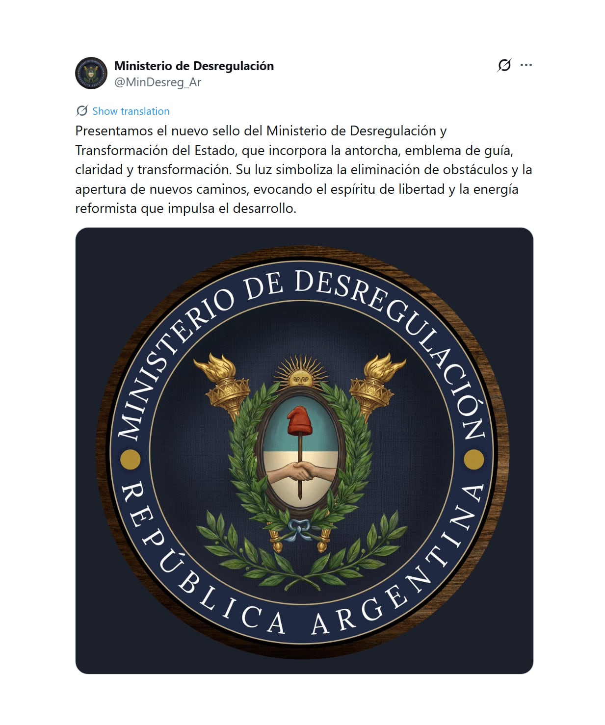 Asimismo, el Ministerio de Desregulación del Estado, que está a cargo de Federico Sturzenegger, sostuvo que en sus cambios suman “la antorcha, emblema de guía, claridad y transformación. Su luz simboliza la eliminación de obstáculos y la apertura de nuevos caminos, evocando el espíritu de libertad y la energía reformista que impulsa el desarrollo”.