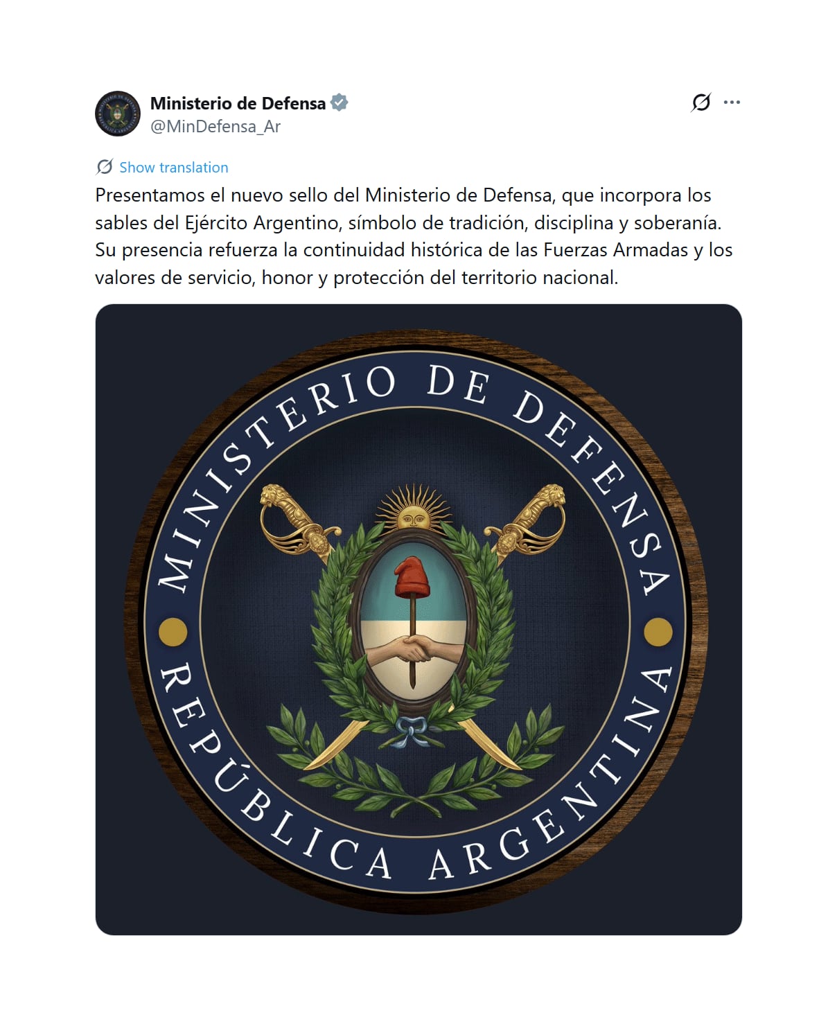 En esa línea, otra de las carteras que cambiaron de conducción fue el Ministerio de Defensa, que tras la salida del flamante diputado electo, Luis Petri, por la llegada de Carlos Presti. Justamente, el nuevo escudo incorporó “los sables del Ejército Argentino, símbolo de tradición, disciplina y soberanía. Su presencia refuerza la continuidad histórica de las Fuerzas Armadas y los valores de servicio, honor y protección del territorio nacional”.
