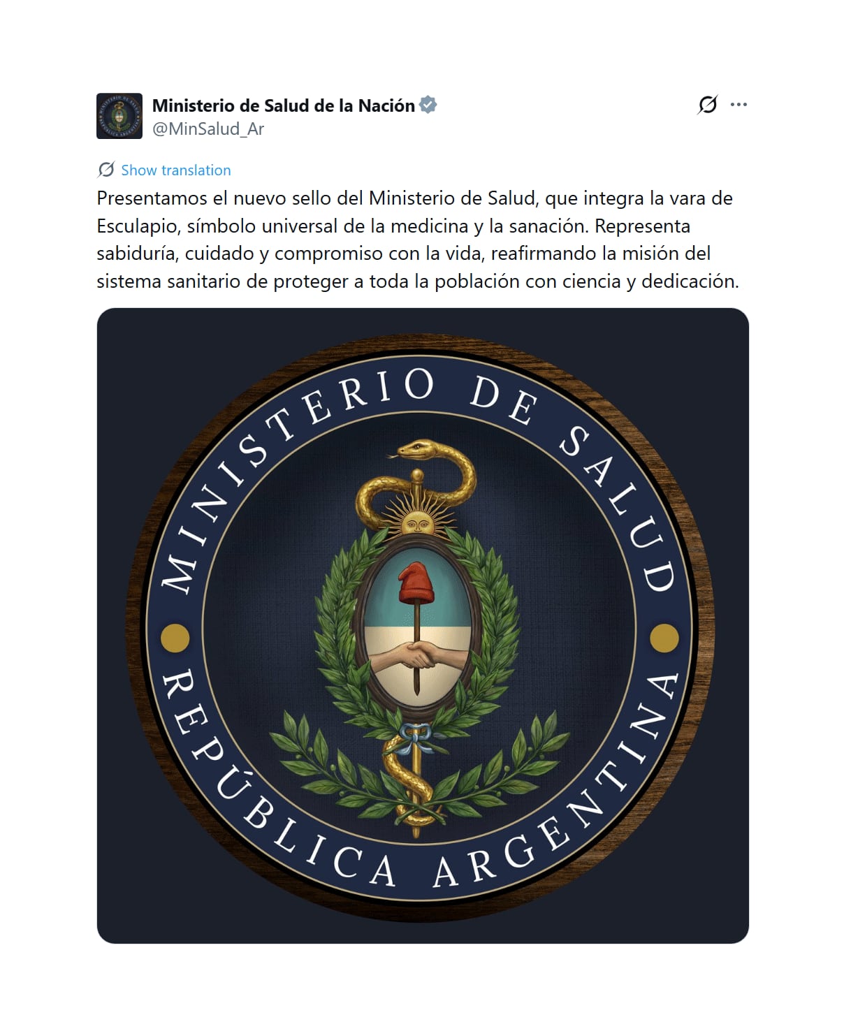 Otra de las carteras que sumó un ícono mundialmente conocido fue el Ministerio de Salud, con Mario Lugones a la cabeza, que agregó la vara de Esculapio, “símbolo universal de la medicina y la sanación. Representa sabiduría, cuidado y compromiso con la vida, reafirmando la misión del sistema sanitario de proteger a toda la población con ciencia y dedicación”.