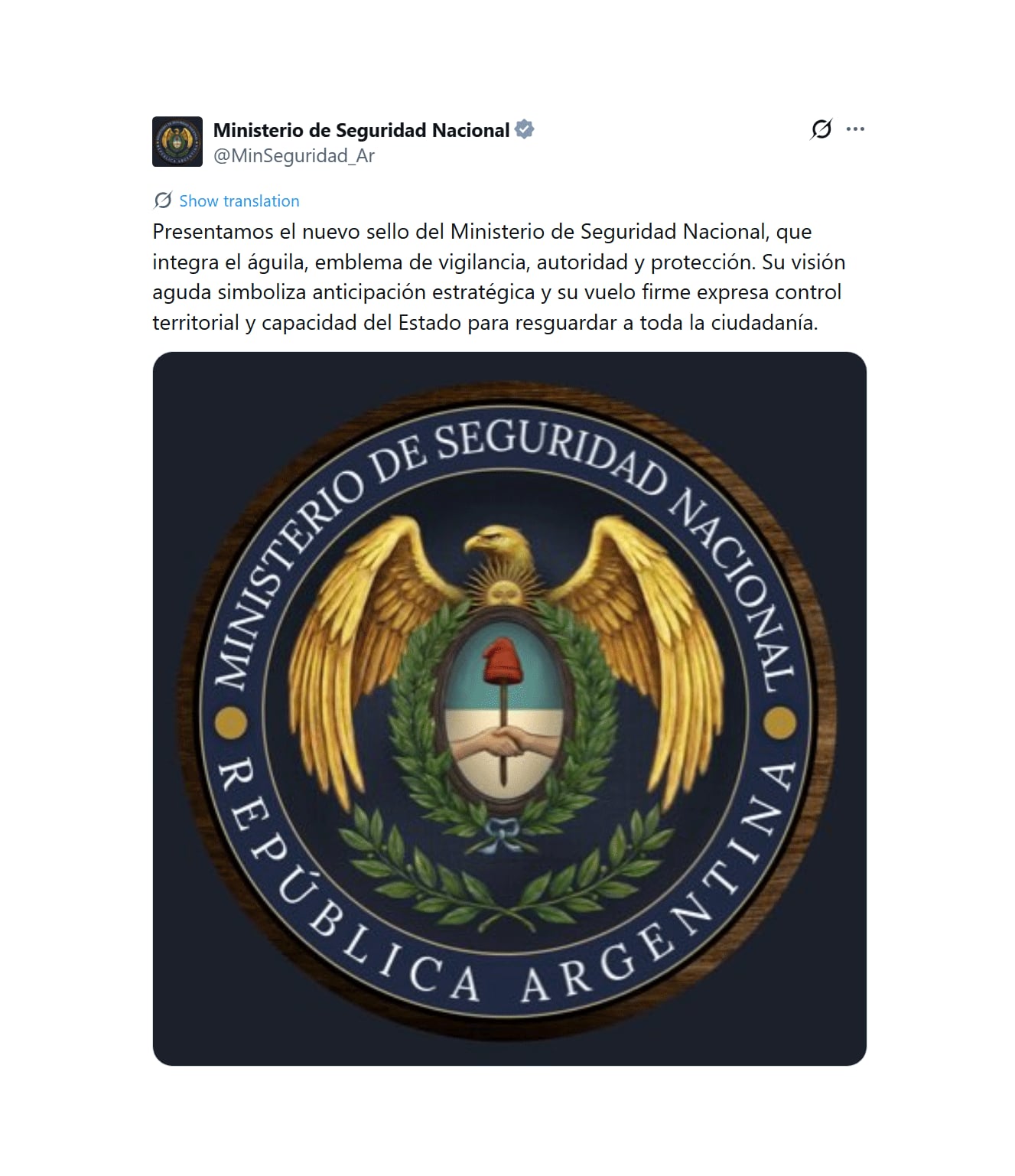 Para el Ministerio de Seguridad Nacional, una de las carteras que cambió de titular con la salida de Patricia Bullrich, quien estará en el Senado, por la nueva ministra Alejandra Monteoliva. Según comunicaron, el nuevo logo “integra el águila, emblema de vigilancia, autoridad y protección. Su visión aguda simboliza anticipación estratégica y su vuelo firme expresa control territorial y capacidad del Estado para resguardar a toda la ciudadanía”.