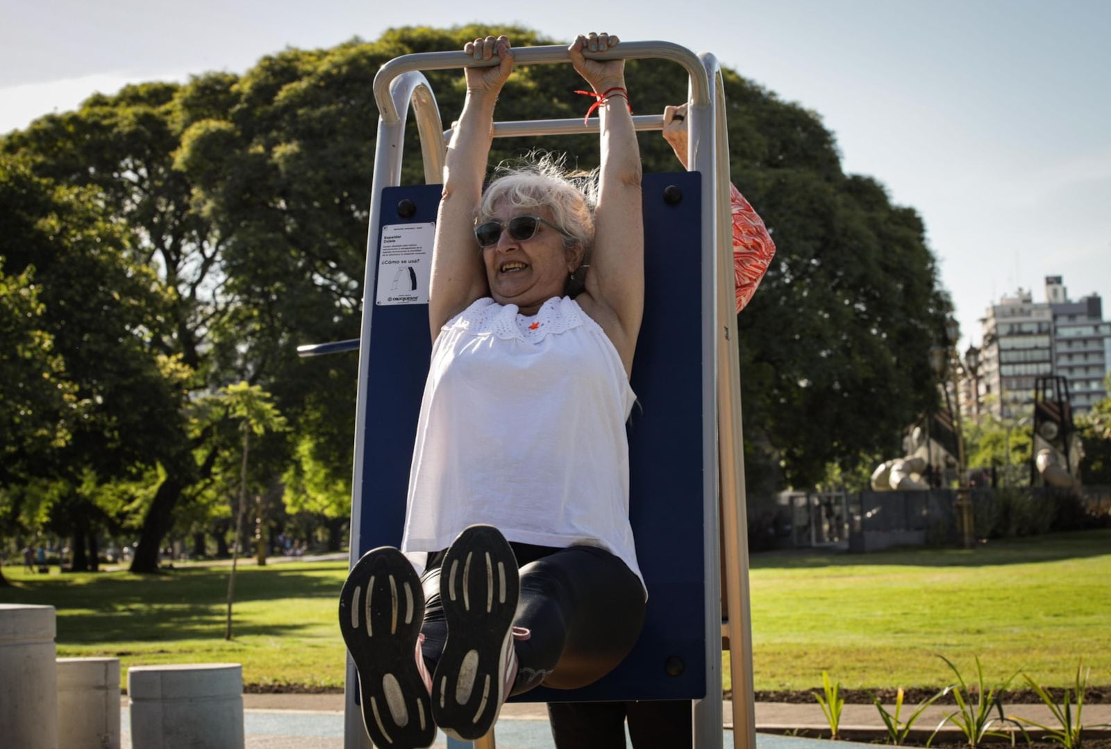 En la Plaza Vicente López y Planes, la oferta contempla ejercicios de estiramiento con apertura de brazo y panel giratorio, coordinación con la columna con ondas y fuerza con el ejercitador de pantorrilla, el banco con pedales, el balance con resorte sentado y el equipo “arriba y abajo”.